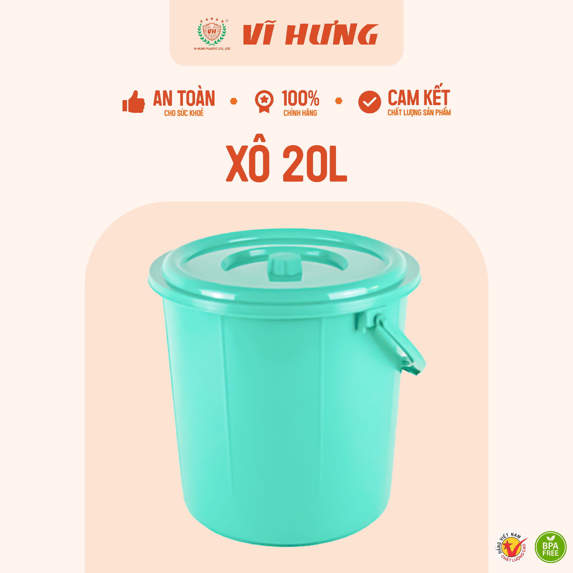 Công nghệ sản xuất. Mỗi xô nhựa Vĩ Hưng được ép phun từ một khuôn duy nhất trên máy ép phun công nghiệp, với quy trình kiểm soát nhiệt độ và áp suất tự động. Phương pháp ép phun đảm bảo thành xô đều, không có bọt khí bên trong và không có điểm yếu tại các mối nối.