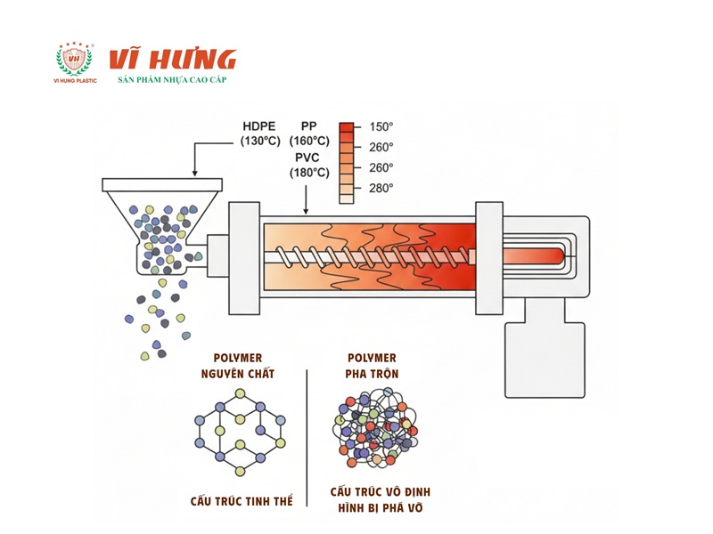 Khi nhiều loại nhựa có nhiệt độ nóng chảy khác nhau bị trộn lẫn, vật liệu không còn một điểm nóng chảy cố định mà chuyển thành khoảng nóng chảy rộng hơn và khó kiểm soát trong gia công.