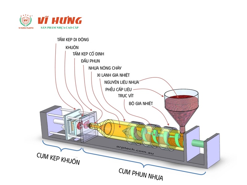 - Tạo hình sản phẩm: Nhựa nóng chảy được định hình bằng các công nghệ khác nhau tùy loại sản phẩm: