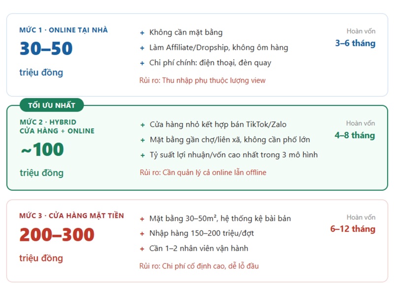 - Mức 30 – 50 Triệu VNĐ (Online tại nhà): Chi phí tập trung vào thiết bị quay video (điện thoại, đèn) và nhập lô hàng nhỏ. Đây là mức an toàn, kết hợp làm Affiliate/Dropship để không phải ôm hàng.