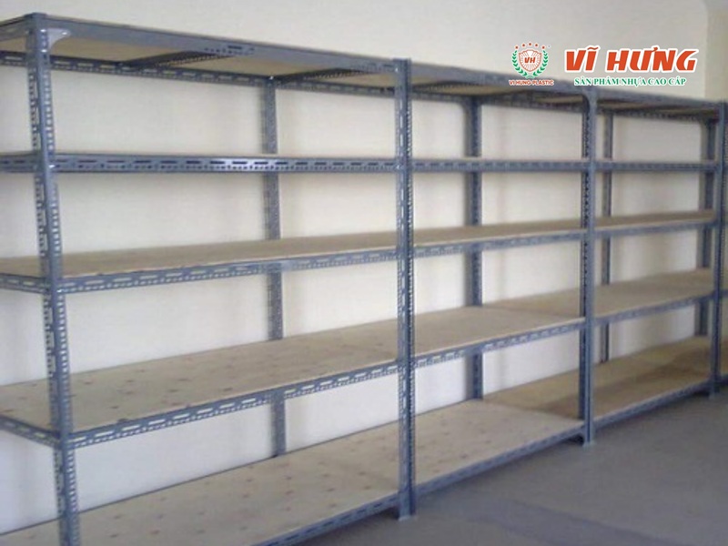- Tận dụng chiều cao: Sử dụng hệ thống kệ sắt V lỗ cao chạm trần (2.8m – 3m) để sắp xếp thau, rổ, giỏ nhỏ. Phương pháp này tiết kiệm đến 40% diện tích mặt sàn.