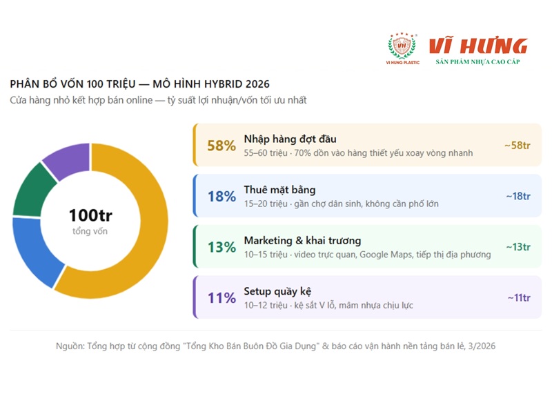 Gợi ý phân bổ 100 triệu đồng cho mô hình Hybrid (Cửa hàng nhỏ + Online). Đây là mô hình mang lại tỷ suất lợi nhuận trên vốn tối ưu nhất hiện nay: