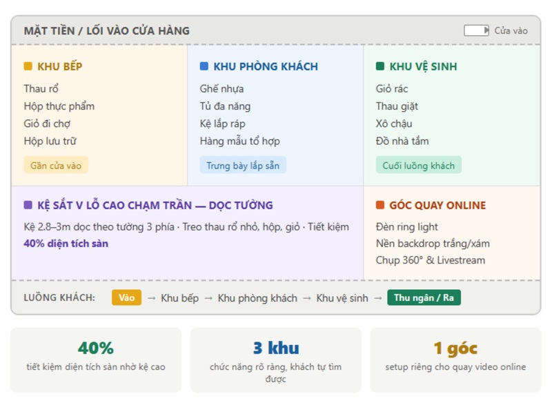 - Phân khu chức năng: Quy hoạch rõ ràng từng không gian: Khu bếp (thau rổ, hộp thực phẩm), Khu phòng khách (ghế, tủ), Khu vệ sinh (giỏ rác, thau giặt) giúp khách hàng dễ dàng tìm kiếm.