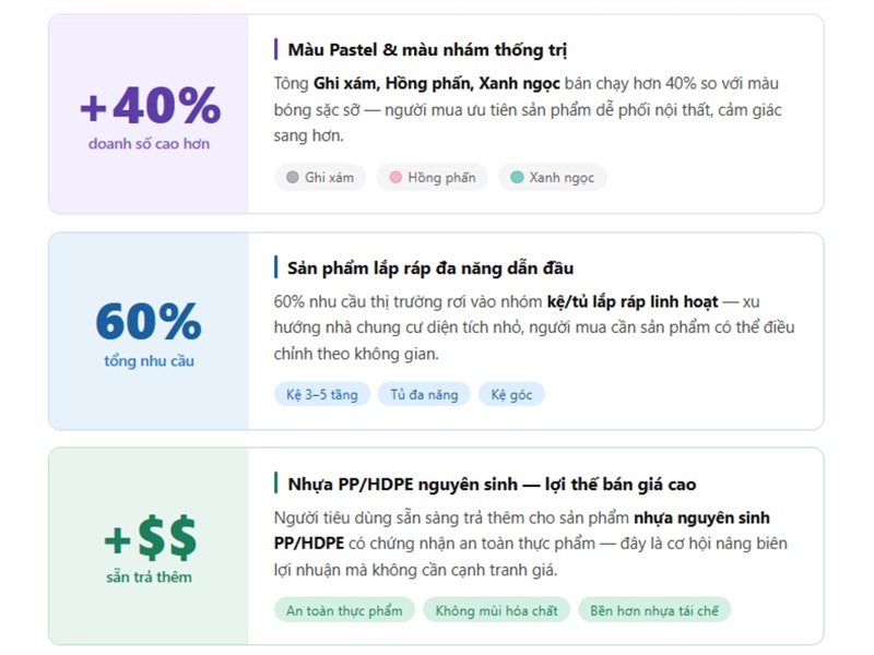 Dựa trên báo cáo hành vi tiêu dùng — 3 thay đổi rõ rệt cần nắm trong thị hiếu người tiêu dùng: màu pastel tăng 40%, sản phẩm lắp ráp chiếm 60% nhu cầu, và nhựa nguyên sinh PP/HDPE được ưu tiên hơn xem chi tiết hình tổng hợp 3 xu hướng này: