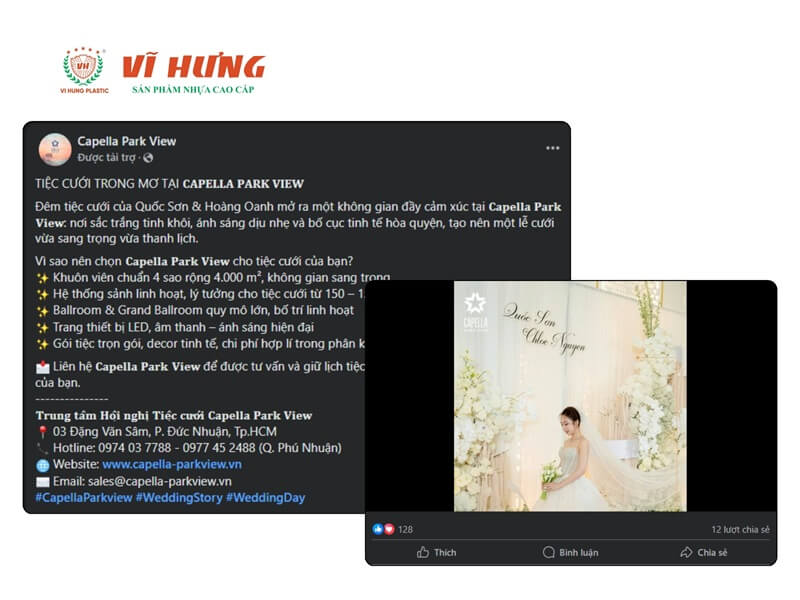 - Nội dung quảng cáo hiệu quả: video 30 đến 60 giây quay sảnh đã trang trí xong (đèn, hoa, phông nền lung linh), kết thúc bằng giá gói và số điện thoại tư vấn. Video sảnh trống không hiệu quả bằng video sảnh đã setup vì khách cần hình dung tiệc cưới của mình trông như thế nào