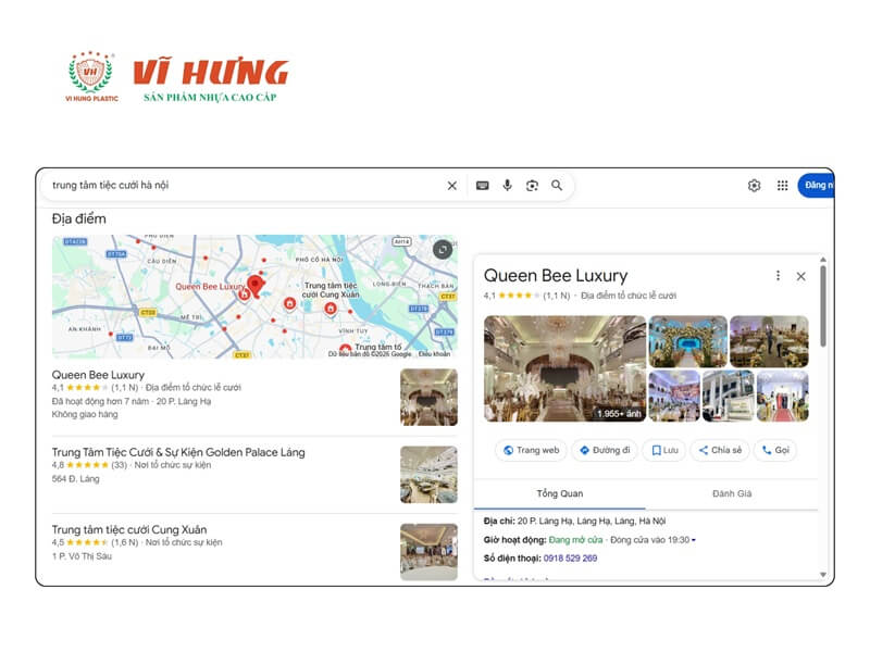 - Đăng ký Google Business Profile đầy đủ: ảnh sảnh chất lượng cao (tối thiểu 20 ảnh, bao gồm sảnh đã trang trí, bàn tiệc đã bày, sân khấu, lối vào, bãi đỗ xe), bảng giá menu theo gói, số điện thoại tư vấn hiển thị rõ