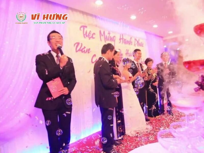 - Video quay cảnh tiệc đang diễn ra (có sự đồng ý của gia chủ): sảnh đông khách, bàn ăn đẹp, MC dẫn chương trình