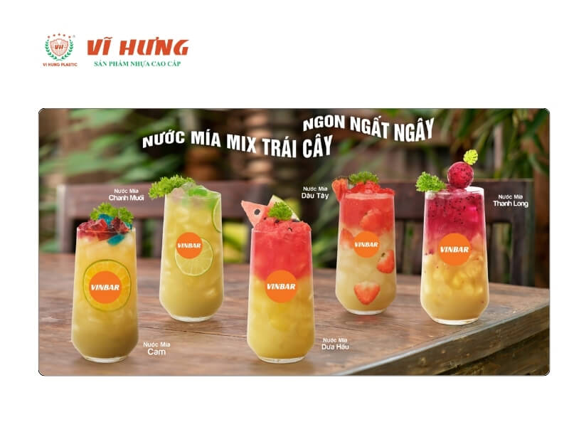 Nhấn mạnh thành phần cụ thể và trái cây tươi trong từng tên món. Cách đặt tên này giúp tách biệt sản phẩm khỏi nhóm nước mía giá rẻ.