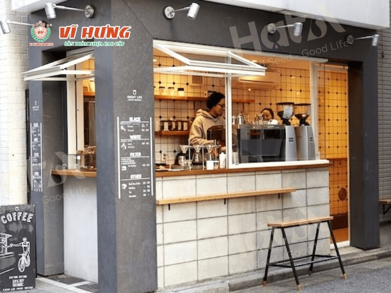 Mô hình quán trà sữa mang đi với thiết kế quầy phục vụ nhanh, tối ưu hóa cho khách mua mang theo hoặc giao hàng, phù hợp cho những vị trí đông đúc, không yêu cầu diện tích lớn tại TP.HCM
