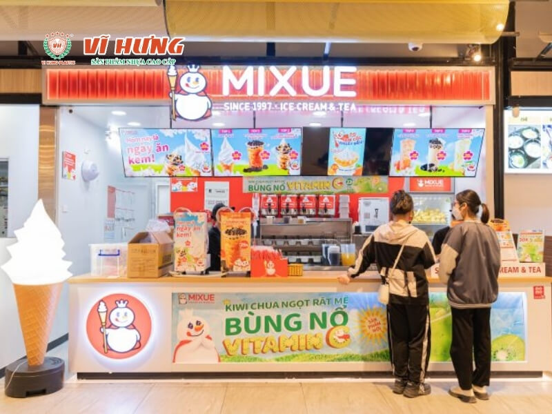 Quán kem trà sữa Mixue trong trung tâm thương mại với biển hiệu đỏ, quầy phục vụ hiện đại, khách hàng đang chọn mua, sản phẩm được trưng bày, và logo thương hiệu rõ ràng