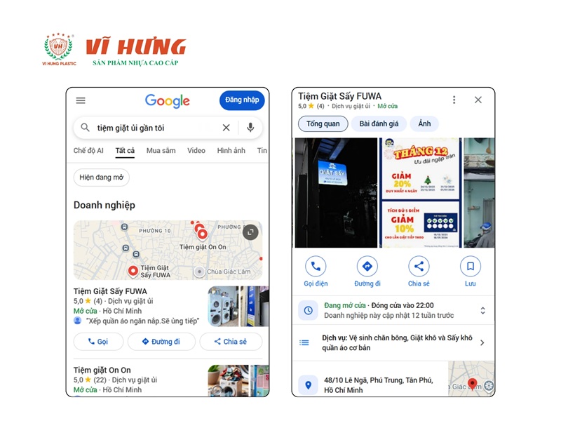 Google Maps là kênh quan trọng nhất cho bất kỳ tiệm giặt ủi cố định nào. Hầu hết khách tìm tiệm giặt bằng cách gõ trên Google Maps hoặc tìm kiếm Google với từ khóa kèm địa điểm như “giặt ủi quận X”, “tiệm giặt ủi gần tôi”,…