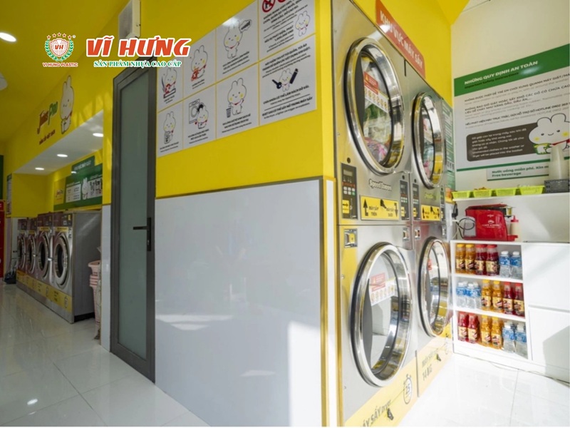 - Tiệm 15–20m²: Quầy nhận và trả đồ đặt ngay mặt tiền. Phía sau xếp 2–3 máy giặt và máy sấy chồng lên nhau để tiết kiệm diện tích. Góc nhỏ dành cho bàn là.