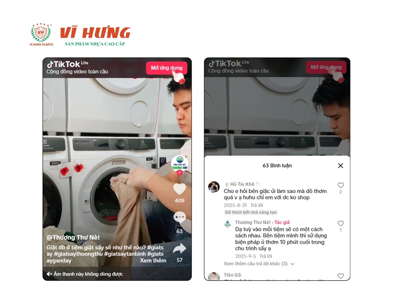 TikTok: Quay video ngắn 15–30 giây về quy trình giặt sạch, before/after quần áo bẩn thành sạch, hoặc cảnh behind-the-scenes vận hành tiệm. Không cần nhiều lượt follow — một video local viral tại khu vực tiệm cũng đủ để thu hàng chục khách mới. Chi phí: 0 đồng, chỉ cần điện thoại và ý tưởng nội dung.