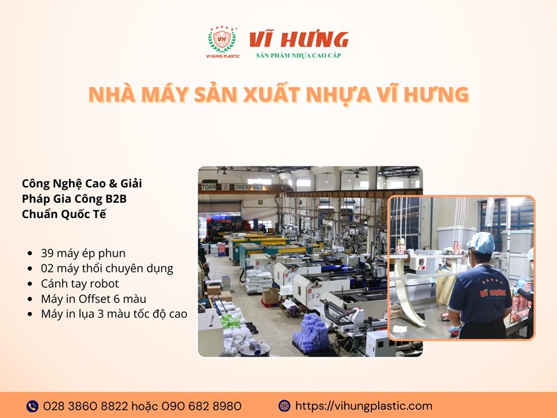 Nhà máy sản xuất Nhựa Vĩ Hưng là đơn vị sản xuất nhựa gốc với hơn 30 năm kinh nghiệm, chuyên cung ứng sỉ và gia công nhựa theo yêu cầu cho thị trường B2B. Tọa lạc tại địa chỉ 309-311 Luỹ Bán Bích, Phường Phú Thạnh, TP.HCM, Nhựa Vĩ Hưng sở hữu năng lực cung ứng khổng lồ đạt 70 container 40’ HC mỗi tháng và đã đạt mốc tiêu thụ hơn 200 triệu sản phẩm trong năm 2023. Chúng tôi khẳng định vị thế là đối tác chiến lược cho các hệ thống siêu thị, đại lý phân phối và các tập đoàn đa quốc gia như Nestlé, Coca-Cola thông qua giải pháp sản xuất khép kín, đạt chuẩn ISO và HACCP.
