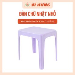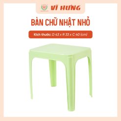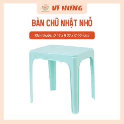 Bàn chữ nhật nhỏ Vĩ Hưng được làm từ nhựa nguyên sinh an toàn, không chứa BPA, bền chắc và dễ vệ sinh. Thiết kế nhỏ gọn, màu sắc tươi sáng, phù hợp sử dụng trong gia đình, quán ăn, quán nước hoặc các hoạt động ngoài trời.